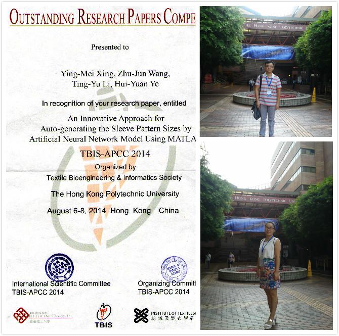 本次国际学术研讨会(TBIS-APCC2014)由纺织生物工程与信息学会、香港理工大学共同举办,由北京服装学院爱慕人体工学研究院、粤港国际纺织工程联合研究中心、陕西省服装工程技术研究中心、纺织生物功能材料工业技术革新联盟、西安工程大学等单位协办。大会共收到来自美国北卡罗莱纳州立大学、加拿大阿尔伯特大学、克罗地亚萨格勒布大学、英国布莱顿大学、日本信州大学、韩国釜山国立大学、东华大学、江南大学等国内外40多家单位的200多篇论文。经大会评审,我校王竹君和邢英梅两位教师的论文在"Outstanding Research Papers Competition"竞赛单元中脱颖而出,被授予"杰出研究论文(Outstanding Research Paper)"的荣誉称号。这是来自安徽省高校的研究论文首次在这一赛事中获奖,受到了大会组委会和国内外同行的好评与认可,提升了我校及纺织服装学科的国际知名度。