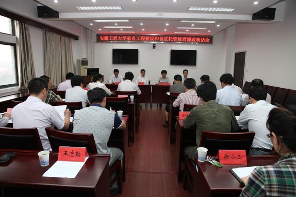 会上,李震宣读了《在安徽工程大学工程建设中遵纪守法廉洁自律承诺书》。郭兴众宣读了《安徽工程大学对托管食堂经营者的纪律要求》。两个重点建设工程项目的甲方(校方)工作人员、乙方(承建方)负责人、监理人员分别在《承诺书》上郑重签名。