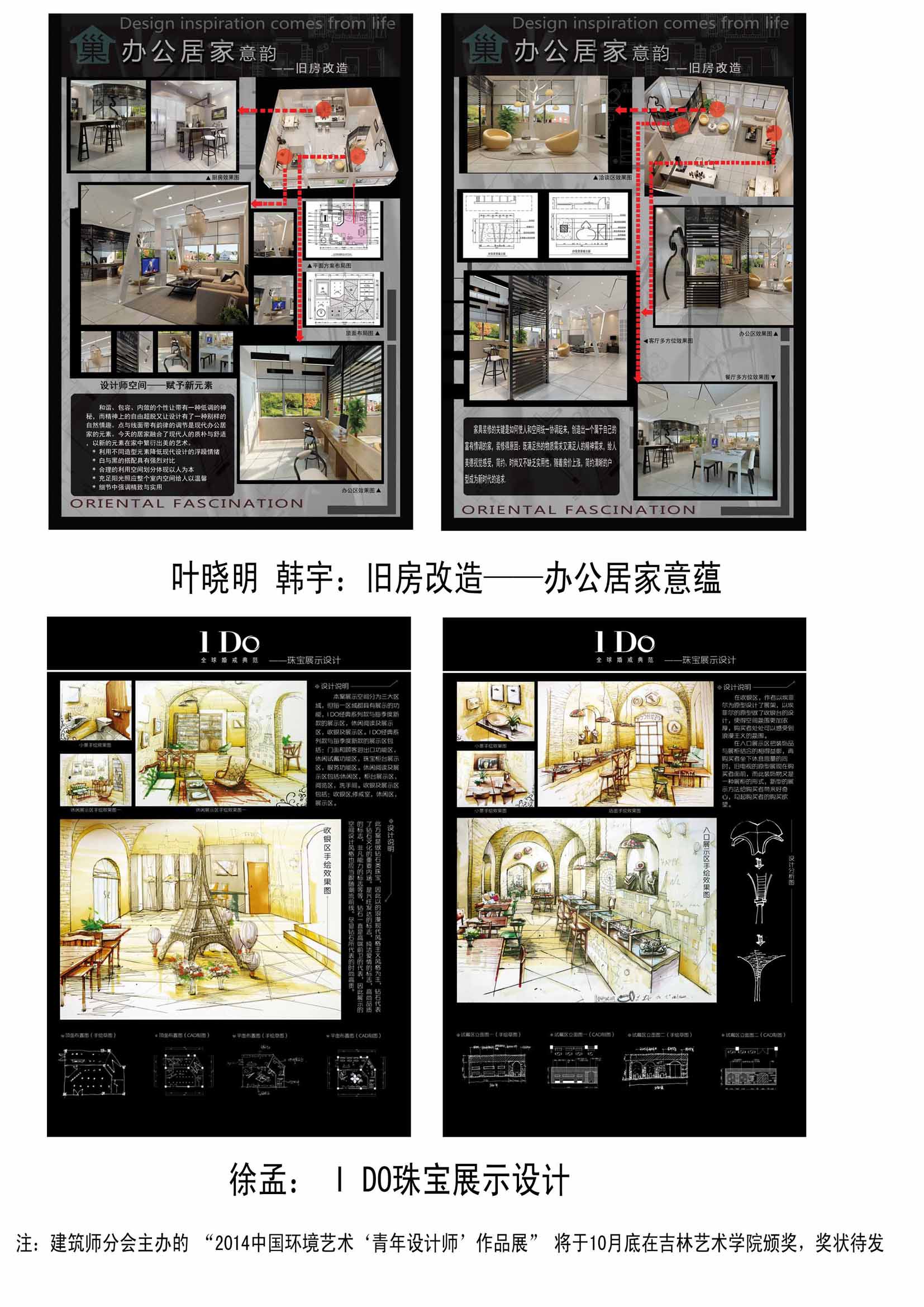 “2014中国环境艺术‘青年设计师’作品展”组委会共收到来自全国425所单位、院校投寄的3156件作品,第一次初评精选出903件作品,评委专家们秉持着“公平、公正、透明”的原则最终评选出了649件入选作品。我校艺术学院环艺111班叶晓明、韩宇的作品《旧房改造——办公居家意蕴》获本次大赛室内住宅空间设计奖(本科组)入围奖,该组中金、银、铜奖空缺,优秀奖6项,入围奖16项;我校艺术学院环艺103班徐孟的毕业设计作品《I DO珠宝展示设计》获本次大赛手绘与模型表现奖(本科组)入围奖,该组中金、银奖空缺,铜奖3项,优秀奖13项,入围奖27项。