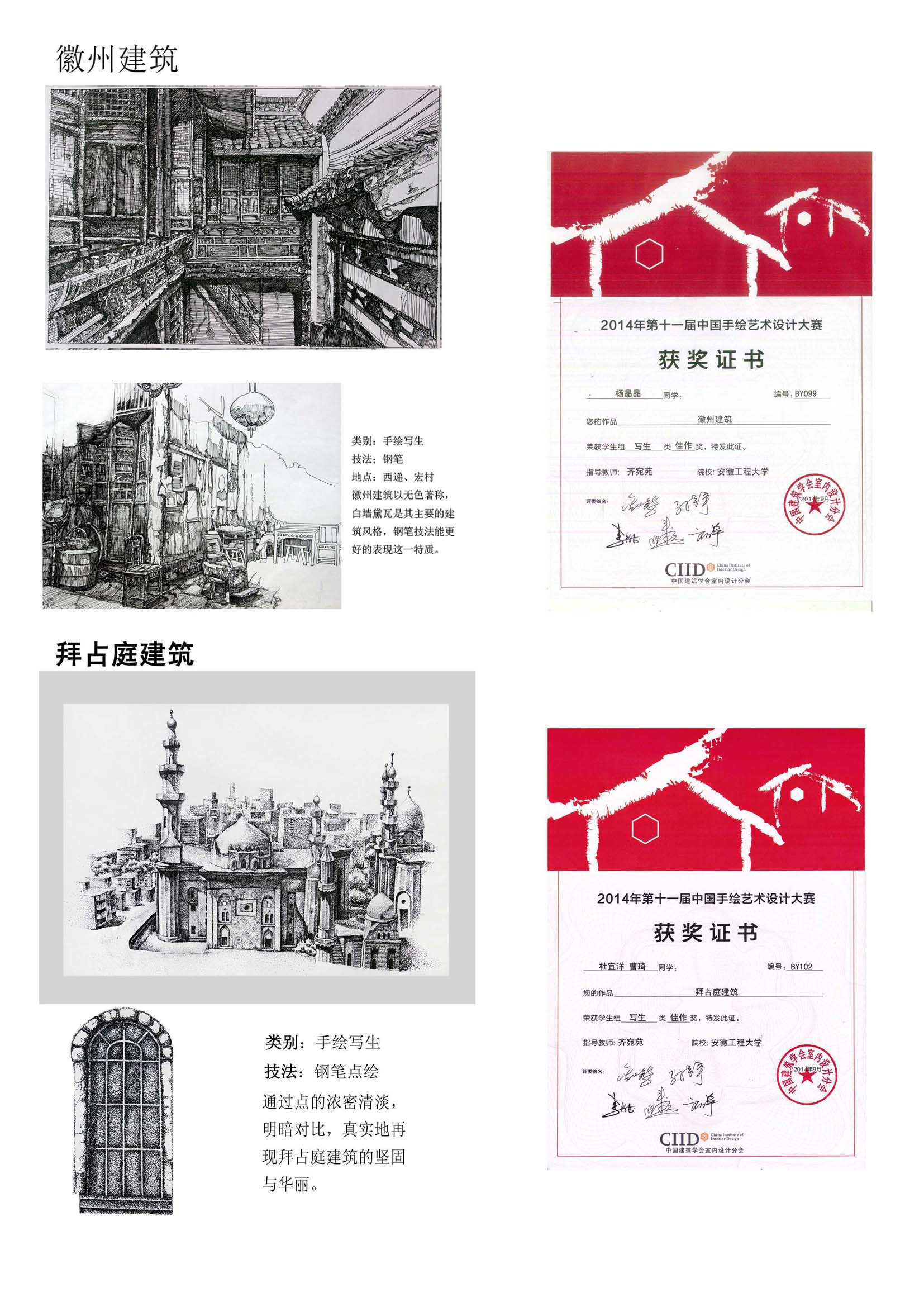 “2014年第十一届中国手绘艺术设计大赛”共征集到790名参赛者的839幅作品,学生写生组共评出一等奖2个,二等奖4个,三等奖6个,优秀奖36个,佳作奖50个。我校艺术学院环艺111班杨晶晶同学的《徽州建筑》和环艺112班杜宜洋、曹琦合作的《拜占庭建筑》两个作品均获佳作奖。