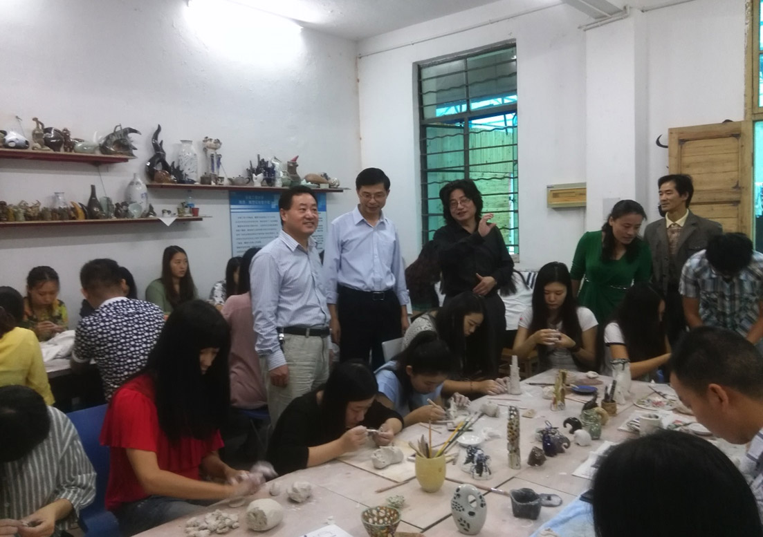陶瓷工作室的建设和发展得到了学校有关部门和学院的关心和重视。9月下旬,校党委宣传部部长孙浩然和副部长吴月红在学院负责人的陪同下,现场察看了学生创作陶瓷作品,他们对学生的创意作品给予了充分的肯定,并对这些作品可能用于学校校园文化建设提出了很好的建议和意见。另外,在国庆放假前,校保卫处处长陈其峰率领保卫处工作人员对陶瓷工作室的安全情况进行检查指导。通过检查,他们了解了教学及实践工作中的困难,对陶瓷工作室教学场地及窑炉安全等方面提出了整改建议。学院要求陶瓷工作室按照建议进行整改,安全规章制度上墙,划出安全重点区域,非专业人员禁止入内,禁止学生操作窑炉设备,确保了教学实验的安全。