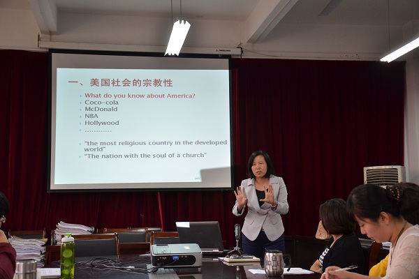 接着,张凤梅做了题为“美国宗教保守派社会意识的复醒”的讲座。讲座内容围绕“美国社会的宗教性、美国宗教保守派及其社会意识的复醒”讨论了美国宗教保守派发展的阶段和特点,说明了宗教以其有形(宗教团体)和无形(宗教信念)的双重力量对美国社会生活的影响,使教师们对宗教在美国政治、生活中的作用有了新的认识。