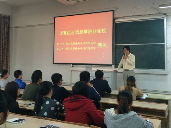 10月15日下午,计算机与信息学院分党校第二十期入党积极分子培训班结业典礼暨第二十一期入党积极分子培训班开学典礼在2教307教室隆重举行。校学生处副处长胡家增,计算机与信息学院党委书记、院分党校校长邬海量,院团委副书记马晓琼,院学生第三支部书记、院分党校第二十一期入党积极分子培训班班主任罗国旗,院学生第一支部书记、院分党校第二十期入党积极分子培训班班主任刘畅出席了开学典礼,第二十期和二十一期入党积极分子培训班全体学员参加了典礼。典礼由马晓琼主持。