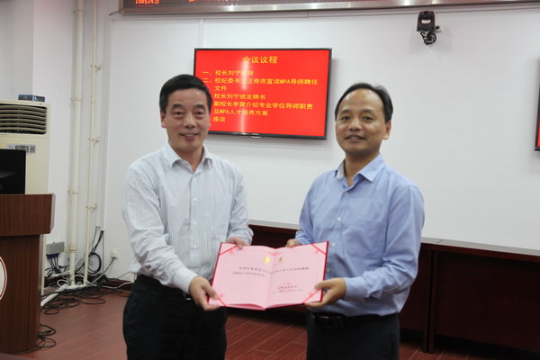 汪奇燕宣读安徽工程大学MPA导师聘任文件之后,刘宁向中共安徽省委宣传部理论处调研员、安徽省社科规划办公室主任唐国富等校外导师,颁发了导师聘书。