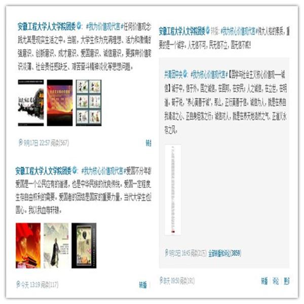 9月份,人文学院在团属微博上开展#我为核心价值观代言#的主题微博活动。活动中,团属微博上发表有关社会主义核心价值观的理论文章,报道学院践行社会主义核心价值观的主题活动,并转播安徽共青团等官方微博的相关主题微博。理论指导实践,实践践行理论,主题微博活动的举办,为相关活动的实践提供思想基础,有利于社会主义核心价值观主题的进一步广泛传播。