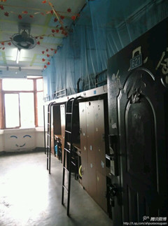 下面就让我们随着镜头走进生化学子宿舍。男生4栋生化学院202宿舍,分别住着来自不同地区的6个大男孩,20平方米左右的房间干净整洁,室内物品摆放有序,墙上贴着的几张画报让宿舍增添了许多生活气息。寝室获得“太极之家”、“体育之星”寝室和优良学风示范寝室,几位室友大一就开始住在一起,平时经常一起学习、出游,“关系特别‘铁’”。 女生2幢生化学院宿舍则呈现了另一种“家的感觉”。走在整洁亮丽楼道里,会看到一块块“生日板”、“映像墙”与“阅览角”,温情贴心的设置,给人浓浓的家的气氛。而推开每一扇门,都可以看到一道道清新典雅的别样风景。女生们把宿舍当作自己的小天地精心装扮,用简单素雅的壁纸、自做有趣的动漫图案和色彩斑斓的民族布艺,将寝室装点得温暖惬意。女生王敏说,寝室多了家的味道,不仅缓解了想家的情绪,还多了不少温馨的回忆。学校每周的宿舍卫生检查结果生化学院总是独占鳌头,创下校级文明宿舍最好记录。