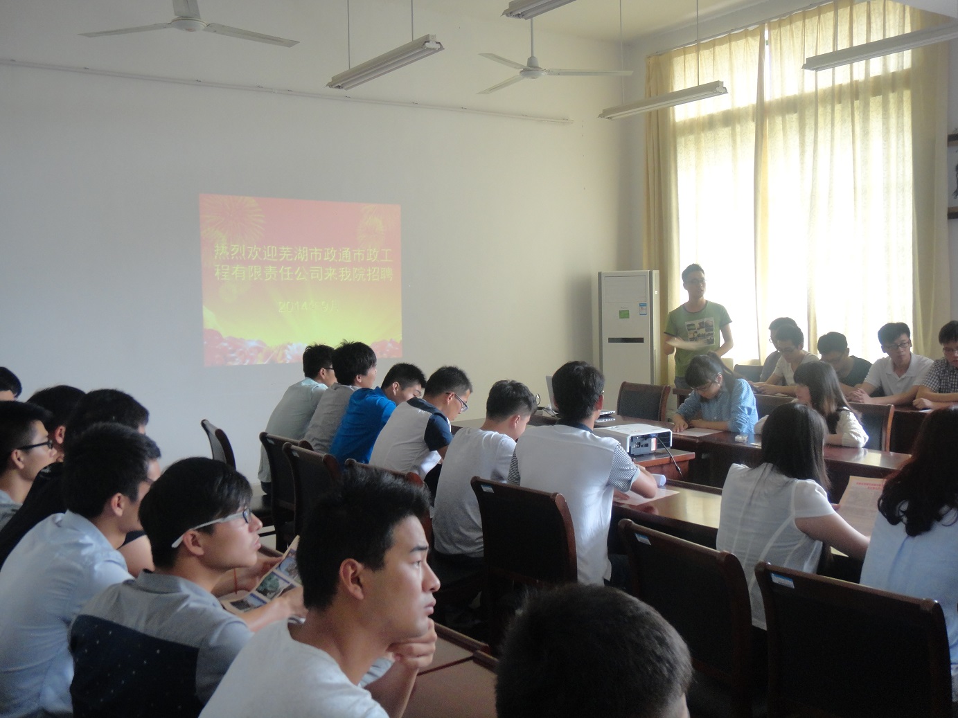 自学校正式启动2015届毕业生就业工作以来,建筑工程学院克服学院成立时间较短、社会知名度不足、校友资源匮乏等困难,发挥专业的社会契合度高、市场需求旺盛的优势,主动作为,多措并举,有针对性地联系省内外土建类的主管部门、行业协会和重点企业,全力开拓毕业生就业市场,取得了良好的效果。近期,已有浙江中原地产集团、浙江桃园园林工程有限公司、芜湖市政通市政工程有限公司等先后应邀来校举行专场招聘活动,安徽鲁班集团、芜湖华衍水务、浙江中南建设集团、广东合迪科技股份有限公司等正在洽谈中。