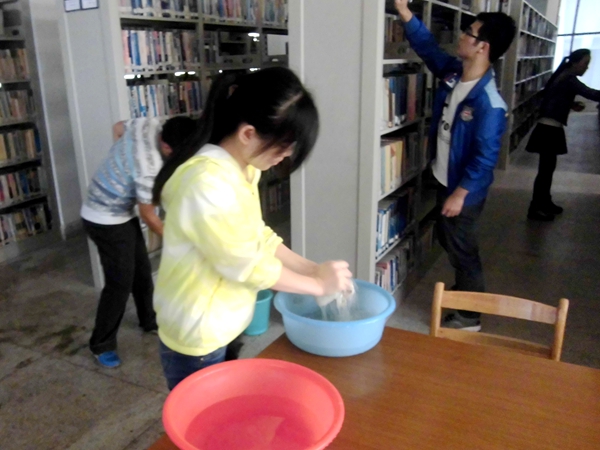 学员们自带清洁工具,在图书馆老师的指导下,开展各项义务劳动。大家分工合作,男生打水、拖地,女生打扫书架、擦拭窗子。学员们不怕苦,不怕累,勤奋细致,将图书馆打扫得干干净净,为读者提供了一个干净整洁的学习阅览环境。