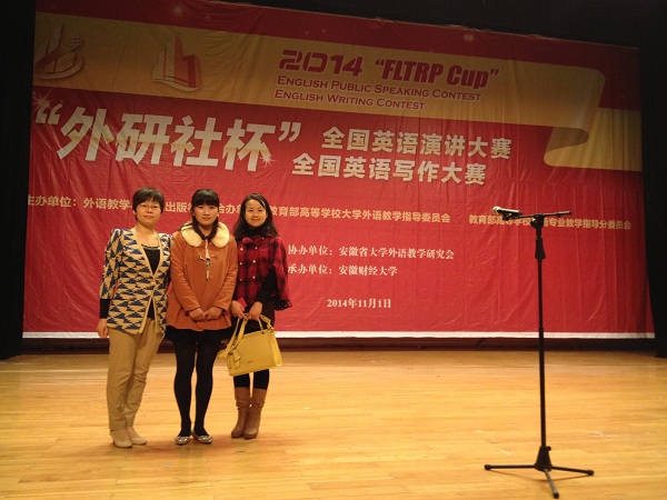 11月1—2日,“外研社杯”(原“CCTV”杯)全国英语演讲大赛(安徽赛区)决赛在安徽财经大学隆重举行,我校外国语学院英语专业12级选手高文静荣获二等奖的好成绩,我校外国语学院教师汪景峰获得指导教师类二等奖。外国语学院院长刘进教授应邀作为本次赛事的决赛评委。