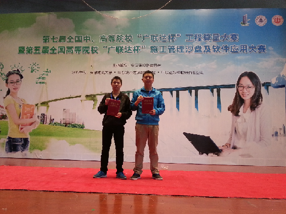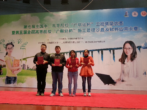 第七届全国中、高等院校“广联达杯”工程算量大赛暨第五届全国高等院校“广联达杯” 施工管理沙盘及软件应用大赛由中国建设教育协会主办,广联达软件股份有限公司、安徽建筑大学、山东城市建设职业学院共同承办,于10月31日至11月2日在安徽建筑大学(南方赛区)和山东城市建设职业学院(北方赛区)两个赛区同步举行。本次大赛共有275所院校500多支代表队参加总决赛,其中参加算量大赛的本科院校128所,参加沙盘大赛的本科院校有89所,参赛学校包括重庆大学、中国矿业大学、四川大学、昆明理工大学,西南石油大学、北京工业大学等等。我校建筑工程学院2011级工程管理专业的6名学生在杨丽、黄小军、张敏三位教师的指导下,经过精心准备,刻苦训练,项目策划及软件应用能力显著提高,以熟练快速的软件操作技能及良好的团队合作能力,在本次大赛中取得了优异成绩。朱永伟、唐磊乐、王亚男、陈丽4名学生组成的施工管理沙盘代表队荣获施工管理沙盘及软件应用大赛全国总决赛二等奖,策划单项一等奖。陈昊、高文明组成的工程算量代表队荣获工程算量大赛全国总决赛二等奖。