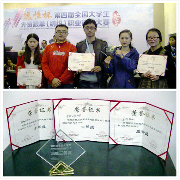 在近日结束的第四届全国大学生外贸跟单(纺织)职业能力大赛中,由我校纺织服装学院段彩玲(服装设计与工程111)、吴倩(轻化工程111)、黄媛媛(纺织工程121)三位同学组成的代表队在王竹君、洪钧和孙哲三位教师的带领下,取得了团体三等奖及两项个人三等奖的佳绩。
