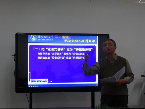 陈文忠教授曾多次获得安徽省优秀社科成果奖、安徽省高校优秀社科成果奖、安徽师范大学教学特等奖、安徽师范大学“皖泰”教学优秀一等奖。他结合自己30多年的教学心得及丰硕的教学科研成果从四个方面进行了阐述:一、基本原则:基于教材,超越教材。强调讲课不仅要基于教材,讲好教材的难点、重点,还要结合学术前沿超越教材,有自己独到的见解。二、备课:把知识纳入逻辑的框架。强调要把“论著式讲稿”转化为“讲授性讲稿”,多讲经典案例。三、讲课:让时间流动起来。强调将学术思考与人生思考有机融合起来。四、听课:让师生互动起来。强调“教育以情谊为基础”,在教学中坚持人格平等,学术平等,课堂上注重知识、思想和方法的传授。陈文忠教授生动幽默的报告不时引起阵阵掌声。