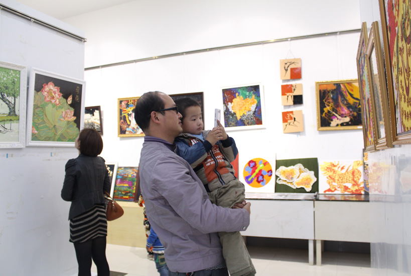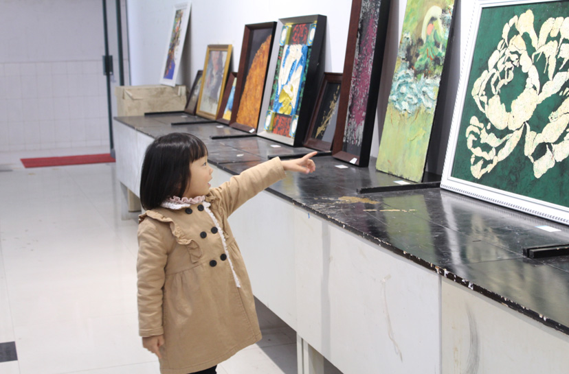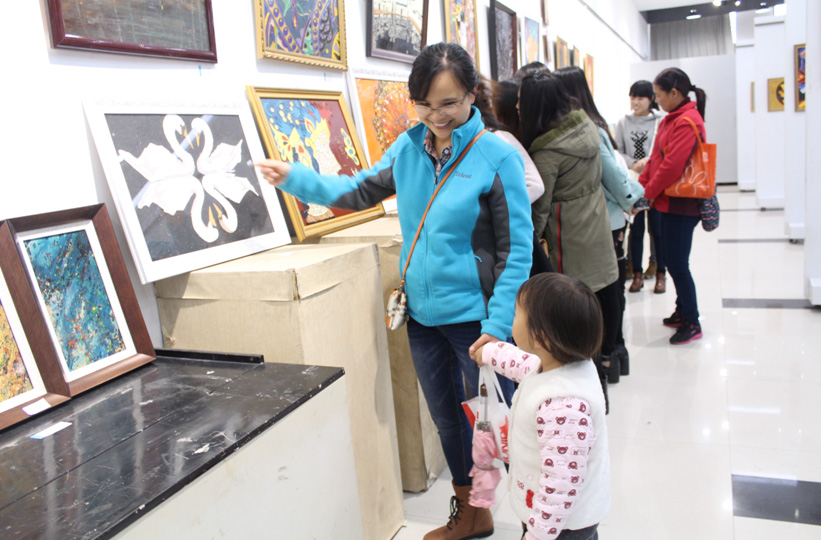 参观伊始,小朋友与大学生亲密互动,在大学生的指引下领略艺术的真谛。展厅内陈列的百余幅学生作品,种类多样,形式各异,有漆画、木浆画、布艺拼贴画、纸艺画等等。展览作品丰富的表现手法和独特的创意引起了小朋友及家长、教师的强烈兴趣;大胆丰富的色彩运用更是令小朋友们耳目一新,尤其是看到一幅幅由蛋壳拼成的艺术作品,孩子们更是表现出好奇与惊叹。