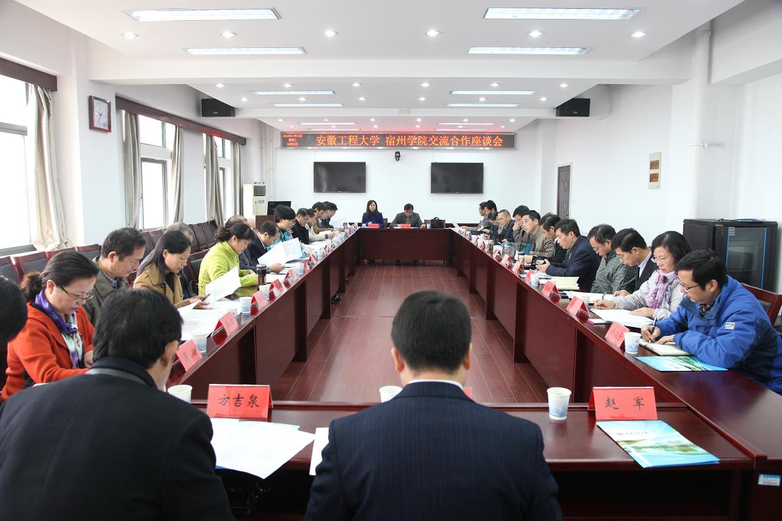 会上,刘宁代表学校对张莉一行的到来表示热烈欢迎。张莉介绍了本次考察的目的。她表示,宿州学院已实现由师范教育向“以工为主,多学科协调发展”的转型,正在积极探索应用型本科教育发展之路。安徽工程大学在应用型人才培养和服务地方经济方面取得了重要成绩,积累了宝贵经验。为能更好地推动宿州学院发展,希望能加强两校交流与合作。李震简要介绍了学校的办学历史、发展现状及在人才培养、学科建设和产学研合作等方面的做法和成效,并希望两校在今后的工作中进一步加强交流合作,相互学习、互相帮助、共同提高。陶庭先着重从专业结构优化、课程体系调整、培养模式改革、实验实训平台建设等方面介绍了学校在教育教学改革上的做法与经验。江明着重围绕2011协同创新中心、机器人产业技术研究院、微电网技术等科研平台建设,介绍了我校在校政、校企合作方面的做法与经验。