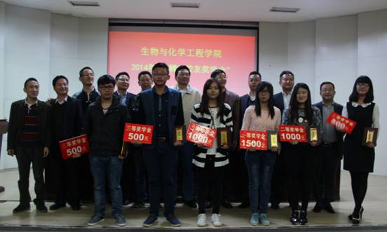 生化学院2014年度“发酵95级校友奖学金”颁奖典礼,作为生化学院建院30周年校友联谊会活动之一,于11月7日下午在学术报告厅隆重举行。发酵95级校友代表赵雨兵、占敬敬,生化学院院长徐建平,党委副书记章兵,发酵95级辅导员项驷文,团委副书记胡云,部分辅导员出席典礼。本年度发酵95级校友奖学金获奖学生及生工专业13、14级全体学生参加典礼。大会由胡云主持。