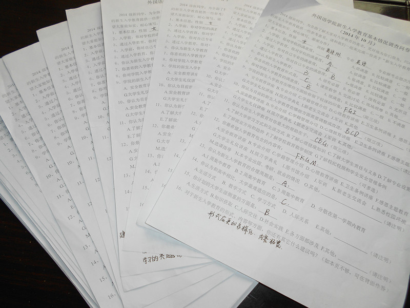 “你认为新生入学教育有必要吗?”、“你对学院的入学教育满意吗?”、“入学教育后,你对自己的专业满意吗?”……,这些是外国语学院2014级新生入学教育满意度问卷调查中的部分问题。上周,外国语学院2014级全体新生参与了问卷调查,并认真填答了问卷。