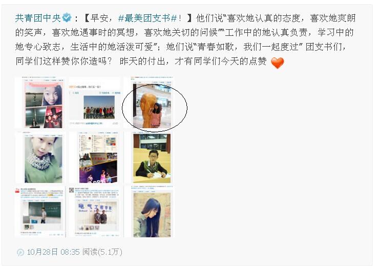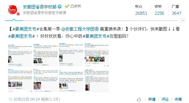 为积极响应团中央开展特色鲜明、持久深入的“我的团支书我的团”主题系列活动的要求,10月20日,校团委启动并开展#最美团支书#微博评选活动,得到全校团员青年的积极响应,先后有12个学院的4821名团员青年在微博上亮相,编辑博文、汇集图片、发布转载。博文各具特色,评选如火如荼。