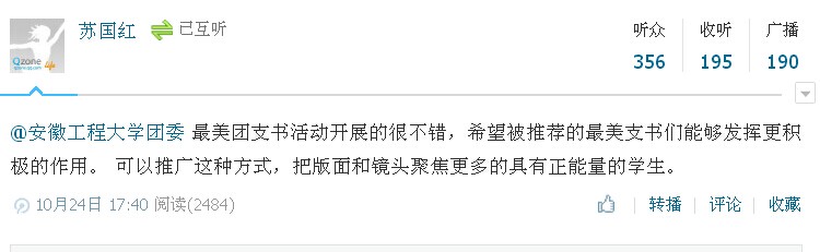 活动开展以来,学校团员青年通过@共青团中央、安徽共青团、安徽团省委学校部、安徽工程大学团委等微博,积极踊跃地对心中最美团支书微博内容进行编辑、转播、评论,在互联网上展现靓丽风景线,释放青春正能量。线上,#最美团支书#话题占据了团属微博的半壁江山;线下,“最美团支书”的问候方式频繁发生在校园的各个角落里。我校青年学子正以90后的方式在全校范围内寻找心中最美的团支书,校园微博达人正以青年人的特色编辑着校园最美团支书的事迹。共青团中央也对我校此次活动给予了高度认可,我校行管131班“最美团支书”秦晶晶微博成功进入团中央“高校最美团支书微博合集”,并将被全国高校团属微博转载。此外,微博上的最美团支书活动还引起了校党委副书记苏国红的关注与重视,她在微博评论中说到“最美团支书活动开展的不错,希望被推荐的最美团支书们能够发挥更积极的作用。可以推广这种方式,把版面和镜头聚焦更多的具有正能量的学生。”