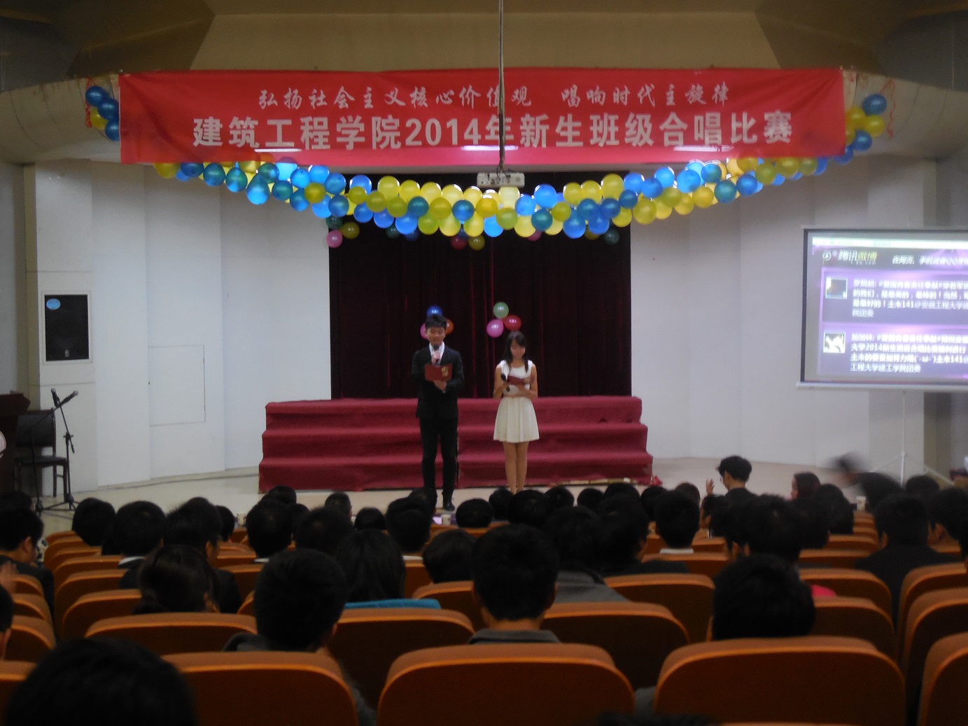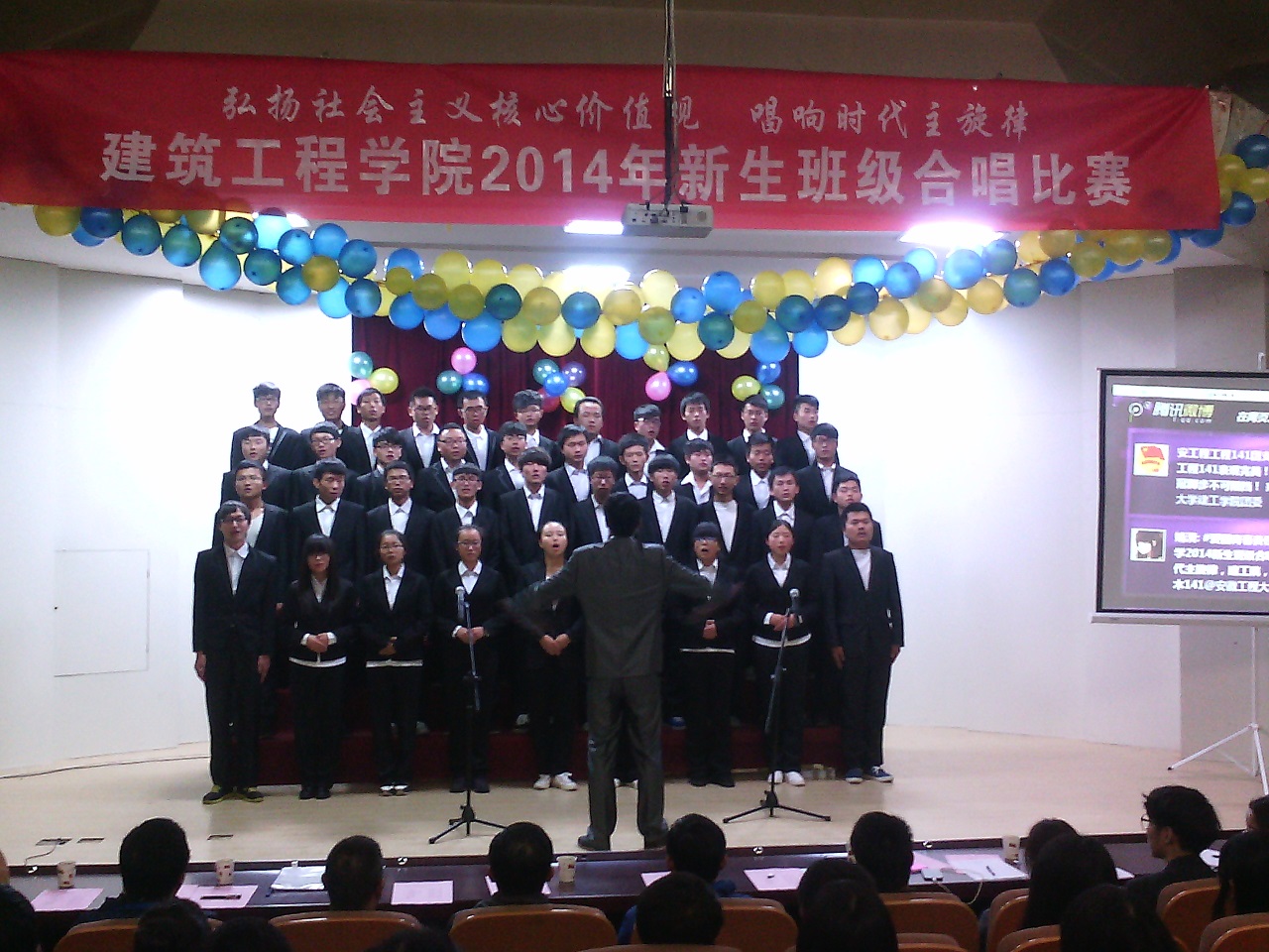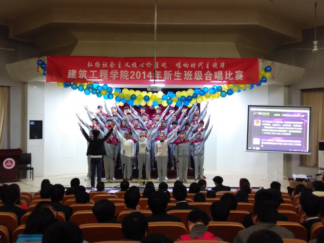 11月12日下午,校学术报告厅内歌声阵阵,激情涌动,建筑工程学院2014年新生班级合唱比赛在这里举行。学院党委书记徐达奇、副书记李烨,团委副书记和辅导员到场观看比赛。