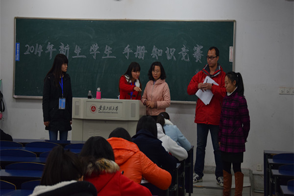 为了督促新生更好地了解和遵守学校的规章制度,全面融入大学学习与生活环境,11月19日下午,外国语学院在6教举行了2014级新生《学生手册》知识竞赛。比赛期间,学院党委副书记谈丽华,团委副书记和新生辅导员到教室查看比赛情况。