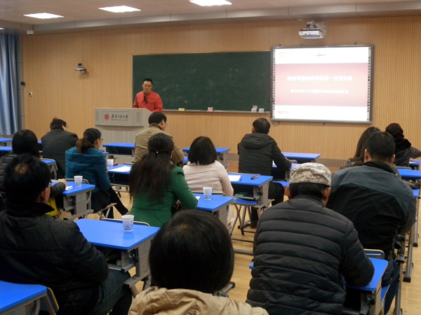 11月25日下午,教辅总支举办了学习贯彻党的十八届四中全会精神的报告会。报告会邀请了我校思政部徐东辉副教授做了题为《法治和德治的有机统一方为大治》的主题宣讲报告。会议由总支宣传委员李琛主持,教辅总支全体党员参加了宣讲报告会。