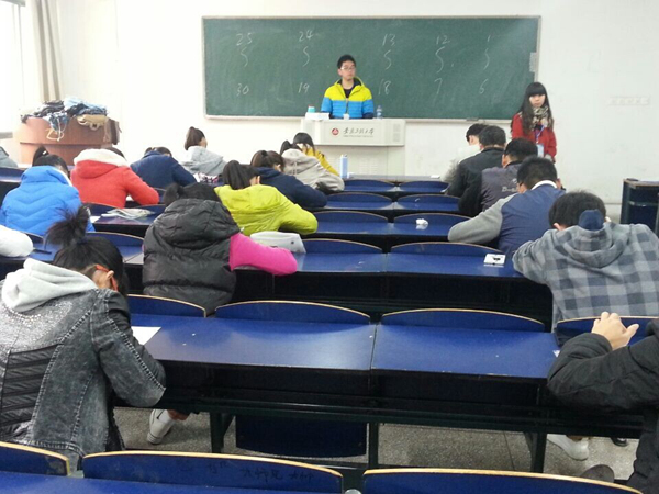 11月22日,6教一楼教室里秩序井然,以闭卷考试形式进行的数理学院2014级新生《学生手册》知识竞赛在此开展,新生辅导员吴敏老师到教室查看现场考试情况。