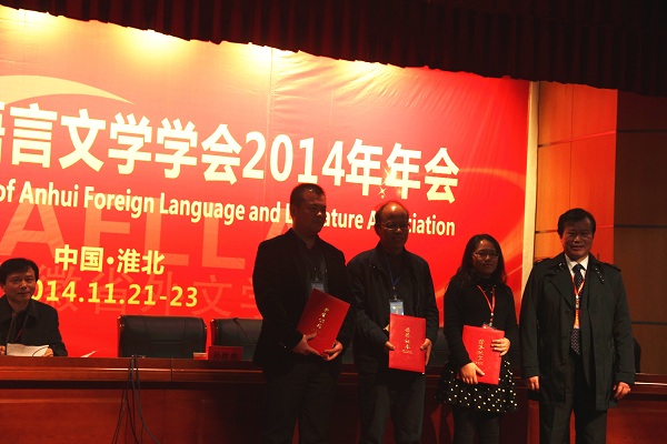 2014年11月22-23日,由安徽省外国语言文学学会主办、淮北师范大学外国语学院承办、上海外语教育出版社协办的“安徽省外国语言文学学会2014年年会”在淮北师范大学隆重举行。来自全省48所高校的240余名外语界专家学者、教师代表出席了本次盛会。我校外国语学院院长刘进和国际交流合作处处长金成星带领我校教师参加了本次年会的学习交流和研讨活动。