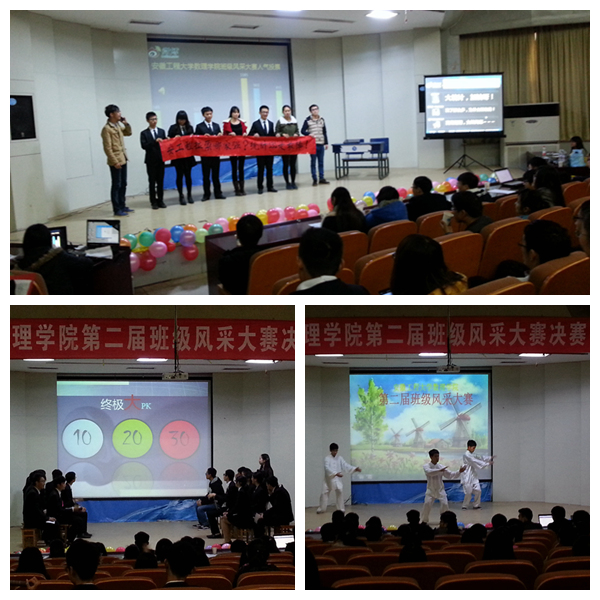决赛主要在班级精神展示、班级风采展示、专业知识知多少三个环节上进行比拼。“班级精神展示”环节,各班级派出代表,通过VCR、PPT等多种形式向大家介绍班级班徽、班训、寝室建设、班级活动等方面的情况,台上台下的互动,让大家深深感受到了班级的凝聚力;“班级风采展示”环节,要求各参赛班级用表演的形式向大家展示班级的特色:金融132班的表演吸引了大家的眼球,优雅的行为举止展示了中华民族从古至今的礼仪,整齐且有力的中枪舞彰显了班级同学的多才多艺;统计132班走秀与班歌的融合是一道独特、靓丽的风景线,篮球、排球、羽毛球、网球等运动彰显了同学们的活力,而班歌的表演更是让同学们为之动容;金融141班的太极表演赢得了热烈的掌声,时慢时快的动作将太极“以柔克刚”、“开合有序”、“刚柔相济”等特点发挥的淋漓尽致,显示了同学们对文化的传承……“专业知识知多少”环节,10分、20分、30分三种风险题,包含了英语、数学、常识各种内容,将场上的选手与场下的观众一起带入了思考的氛围,给了大家一个展示渊博知识的舞台;中场游戏“你比我猜”,各种搞怪的动作和奇怪的语言使得现场充满了欢乐的气氛;微博上墙活动更是吸引了众多的观众参与到比赛中。