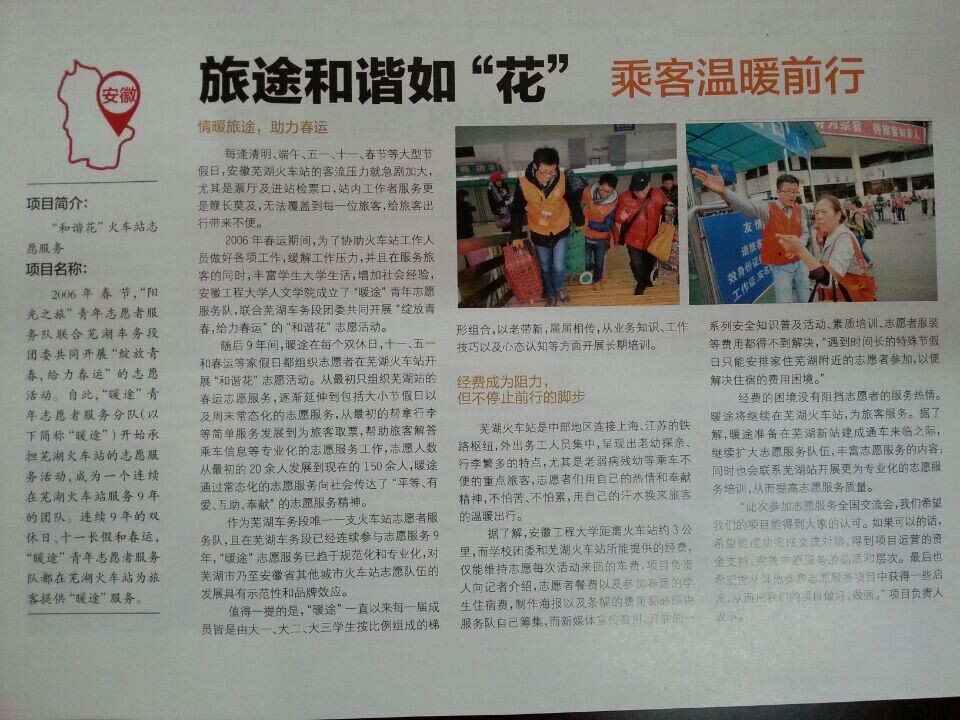 在评审现场,我校“‘和谐花’火车站志愿服务社代表通过项目推介和现场问询等方式,全面详实地向赛事评委专家、新闻媒体、爱心人士等介绍了“和谐花”火车站志愿服务行动项目的流程、受益对象、实施地域及步骤等,并围绕“暖途”青年志愿服务社从无到有、从小到大、从一腔热血到制度化、规范化的九年发展历程生动讲述了我校学子积极投身芜湖火车站志愿服务工作的暖途故事,博得在场评委专家和共青团安徽省委领导的好评。共青团安徽省委副书记李国阳特意为“暖途”画册题字,高度评价这个项目,鼓励同学们再接再厉,坚持把这项志愿服务做下去,取得更大成绩。12月1日《广州青年报》(志交会特刊)刊发《旅途和谐如“花”,乘客温暖前行》图文,将此项目作为安徽赛会13个项目的唯一代表予以重点推介。