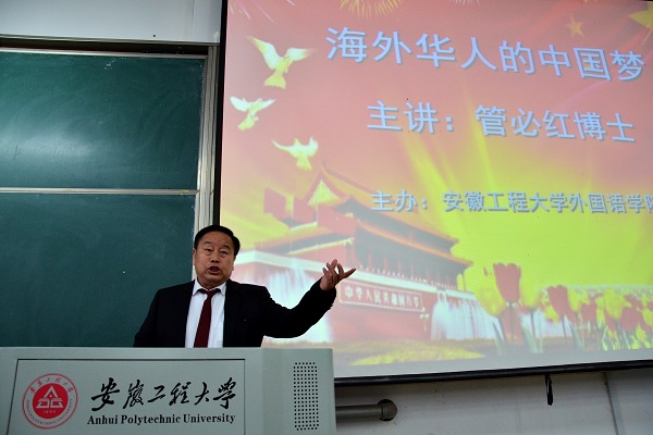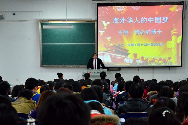 室外寒风细雨,室内暖意融融。12月10日下午,著名爱国侨领、世界华人华侨精英联合会会长管必红博士应外国语学院邀请来我校作“海外华人的中国梦”专场报告。报告会吸引了全校师生近三百余人前来聆听。报告会特邀嘉宾有:芜湖翻译协会会长郑金泽、副会长王开龙以及秘书长王平、副秘书长李君婷。外国语学院院长刘进、党委副书记谈丽华及部分辅导员参加了报告会。报告会由谈丽华主持。