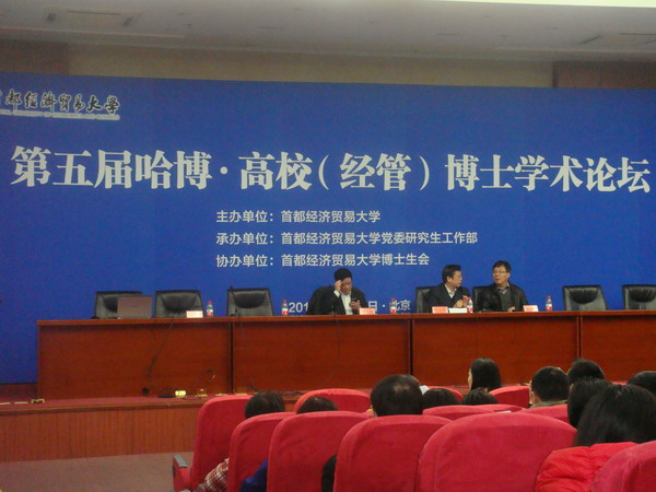 12月12日-13日,由北京市教委主办,首都经济贸易大学研究生工作部承办的2014年第五届哈博·高校(经管)博士学术论坛在北京召开。清华大学、中国人民大学、厦门大学、上海财经大学以及西南财经大学等40多所高校100余名博士(生)参加论坛。我校人文学院教师汪茂泰参加此次论坛,并宣读了学术论文。两名产业经济学硕士研究生随同参会。