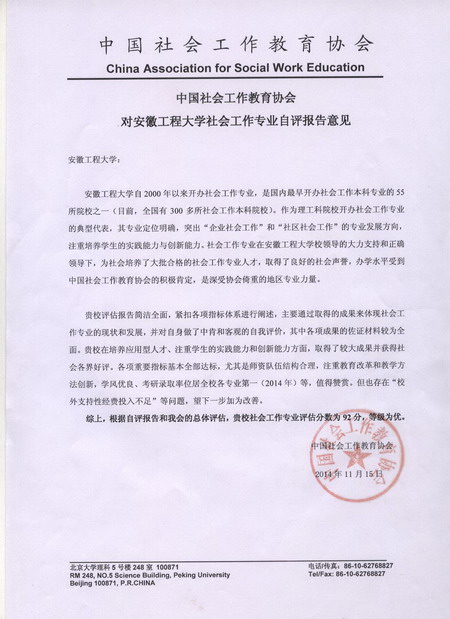 近日,中国社会工作教育协会在北京召开了协会成立二十周年庆典暨“社会治理创新与中国社会工作发展研讨会”。大会总结了社会工作教育协会二十周年的工作,分析了社会工作专业评估情况。令人欣喜的是,我校人文学院社会工作专业在全国社会工作专业评估中,以92分的高分获得“优秀”等级,位于评估院校前20名,顺利通过专业评估,充分体现我校社会工作专业的办学实力。