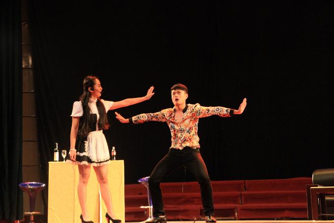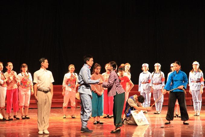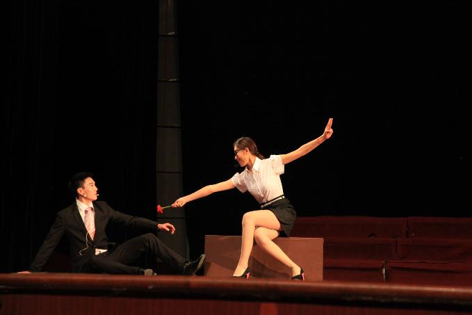 话剧在一曲童歌《粒粒皆辛苦》中揭开帷幕,同学们艺术的再现了粮食生产过程的艰辛和不易,呼唤大家关注和参与光盘行动。随后,《疯狂的探戈》讲述了青年男女在酒精的麻痹下发生的荒唐和危险故事。三个女人一台戏,九个女人唱啥戏?喜剧《九女归一》反映了九位不同的女性,在追求自己另一半的过程中遭遇的各种辛酸,再现了现代社会中男女婚恋一些值得关注的话题,如博士女遇上硕士男怎么就成了灭绝师太;拜金女花枝招展能否成功上位;“珠峰”与“盆地”的爱情能有结果吗;大龄女汉子又能否抓住“小鲜肉”的心等等。话剧《琼花参军》改编于《红色娘子军》,剧中贫农女儿琼花的父母被恶霸南霸天杀害,并将琼花关在监牢里,琼花不堪忍受南霸天的凌辱,冒死冲出牢笼,追求自由。在昏暗的椰林中,琼花被红色娘子军指导员洪常青救下,并指引她加入了红军,最终惩治了恶霸,欢歌笑语迎接新生活!