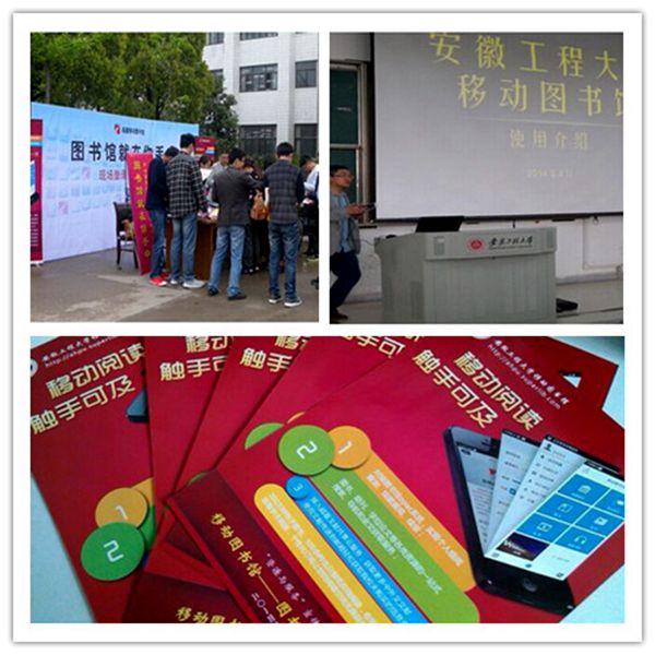 我校移动图书馆自开通以来,图书馆通过网站公告、搭建 “移动图书馆”咨询台、发放手册、陈列展板等方式进行广泛宣传,并先后于“4.23·世界读书日”举办“因为图书馆爱上手机”培训讲座和读者服务宣传月开展“移动改变阅读”活动,帮助同学们现场下载“移动图书馆”客户端、登陆“移动图书馆”,解答在使用“移动图书馆”过程中遇到的问题。