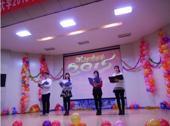 联欢会在活力动感的舞步中拉开序幕。整场活动精彩纷呈,内容丰富,配乐诗朗诵、舞蹈、歌曲、小品、电子琴独奏等悉数登场,特设的互动环节更是让台上台下高潮迭起。一首首动人美妙的歌曲吸引并感染着观众,而来自安徽师范大学的韩国交换生李憓林、林素妍带来的一曲《My destiny》更是让现场气氛活跃起来。小品《无声对话》、《学堂》和《团结》凭借精彩的表演,令在场观众掌声迭起,意犹未尽;应邀的泰国留学生为观众带来的异域风情的泰国舞更是为此次联欢会增色不少。最后伴随着轻快的歌曲大合唱《明天会更好》,联欢会徐徐落下帷幕。
