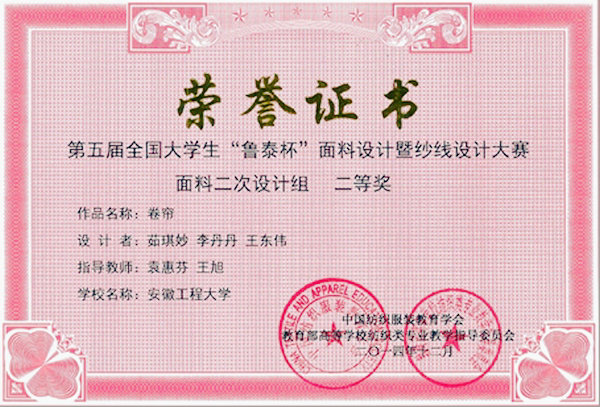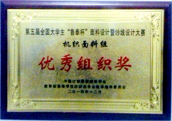 “鲁泰杯” 第五届全国大学生纱线设计和面料设计大赛于2014年12月27日在山东德州学院落下帷幕。我校纺织工程专业2012级学生茹琪妙、李丹丹、王东伟的作品《卷帘》和王东伟、李丹丹、茹琪妙的作品《炫酷》分别荣获面料二次设计组二等奖和三等奖,另有4件作品获得优秀奖。同时,我校还获得优秀组织奖。