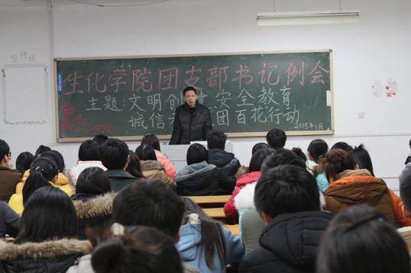 1月5日下午,生化学院在4教204教室召开全院学生干部会议,会议主要传达了冬季学生安全教育、临近期末诚信考试动员、芜湖市申报全国文明城市再宣传以及“团百花”项目申报等近期几项重点工作。会议由学院团委副书记胡云主持,各班级团支书记等学生干部参加了会议。学院党委副书记章兵到会并讲话。