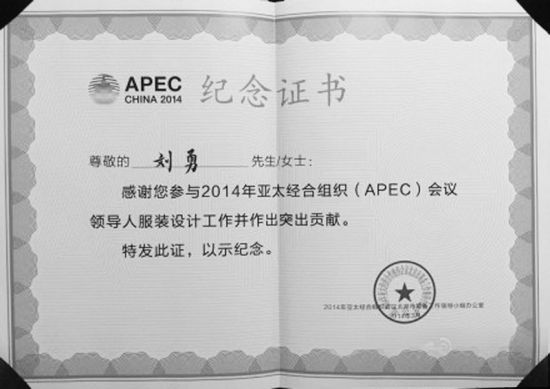 校友刘勇为APEC会议领导人设计“新中装”。我校服装设计专业1989届毕业生刘勇收到了2014年亚太经合组织会议北京筹备工作领导小组颁发的荣誉证书,表彰他在APEC会议领导人服装的设计工作中做出的突出贡献。