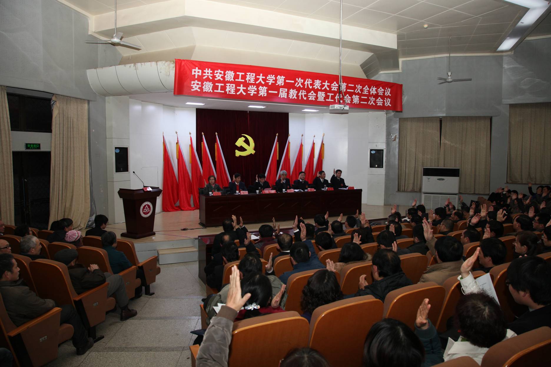中共安徽工程大学第一次代表大会第二次全体会议、第一届教代会暨工代会第二次会议胜利召开。全体党代会代表,全体教代会、工代会代表,列席代表200余人参加了会议。会议听取和审议了《党委工作报告》、《校长工作报告》;审议了《纪委工作报告》、《教代会工会工作报告》、《财务工作报告》、《党费收缴、使用和管理情况报告》、《工会经费审查情况报告》、《党代会提案工作报告》、《教代会提案工作报告》以及党代会常任制相关配套制度,通过了相关决议,进一步明确了2015年学校党、政工作思路和重点任务。