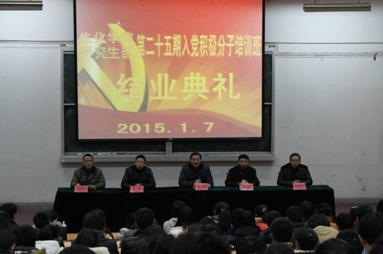1月7号晚7点,生化学院、研究生部分党校第二十五期入党积极分子培训班结业典礼在2教报告厅隆重举行。生化学院党委书记王弘、研究生部党总支书记朱文藻、生化学院党委副书记章兵、生化学院副院长陶玉贵出席了结业典礼。结业典礼由本期班主任高俊杰主持。