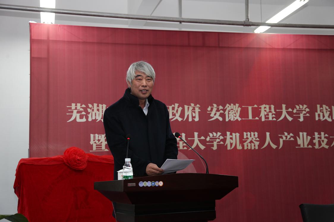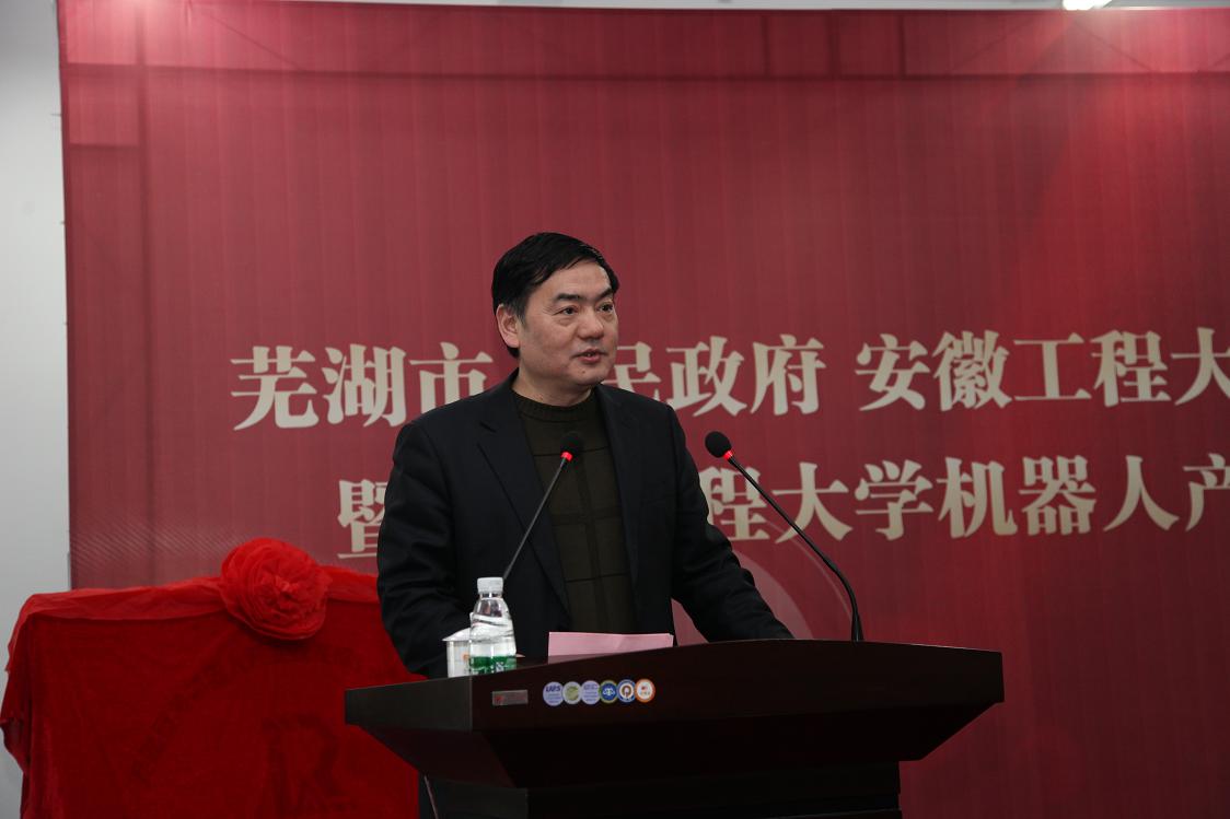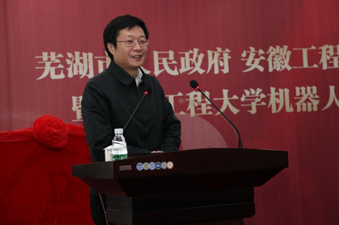 潘朝晖代表市政府做了热情洋溢的致辞。他说,安徽工程大学是芜湖的明星与骄傲,学校注重内涵建设,主动适应芜湖市产业结构调整、推进产学研合作,对芜湖产业发展给予了很大支持,是有胸怀、有眼光的体现。芜湖市政府对此深表感谢。芜湖市较早地实施了“科教兴市”和“创新驱动”战略,是我省2014年唯一保持两位数经济增速的城市。在工业机器人、平板显示、新能源、航空、新材料等产业上,芜湖市奋力抢占全国制高点,面向全球开展工作,经济建设进入了新常态。芜湖市传统产业不断升级,高科技产业充满活力,更给予了大学生在芜创业一揽子的政策支持。在经济下行结构调整形势下,芜湖市“弯道超越”目标的实现,离不开安徽工程大学等优秀的高水平应用型大学的支持与合作。希望市、校以机器人产业技术研究院为新起点,在人才培养、人才引进、重点项目建设、产学研合作、大学生留芜湖工作或创业上进一步加大合作。预祝机器人产业技术研究院取得丰硕成果。