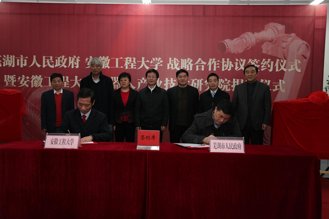 1月18日上午,安徽工程大学与芜湖市人民政府战略合作协议签约仪式暨安徽工程大学机器人产业技术研究院揭牌仪式在芜湖安普机器人产业技术研究院有限公司隆重举行。