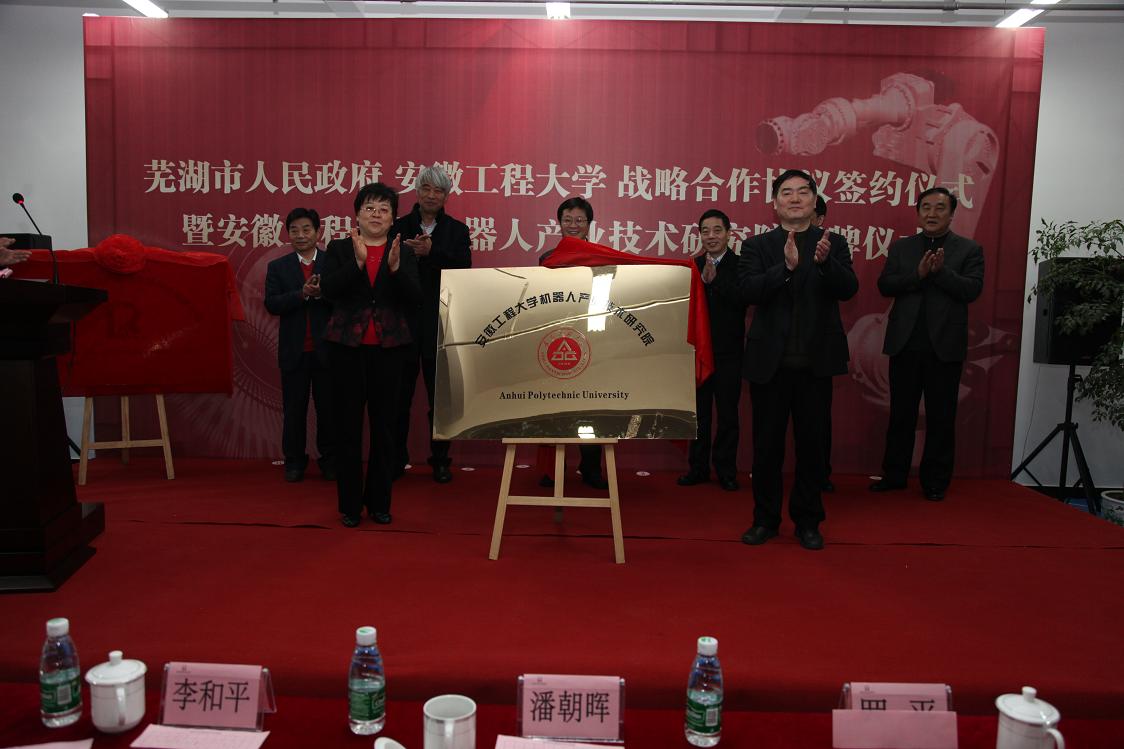 李和平、罗平应邀为“安徽工程大学机器人产业技术研究院”揭牌,张志宏、汪奇燕为“芜湖安普机器人产业技术研究院有限公司”揭牌。