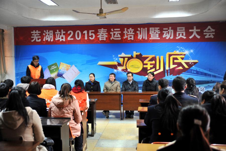 2月4日上午,2015年春运培训暨动员大会在芜湖火车站会议室举行。人文学院党委书记伊长文、副书记章靖平,段关工委副书记吴提生、芜湖站党总支书记吴志祥、站团委负责人、“暖途”青年志愿者服务社代表以及车站工作人员等出席了本次大会。