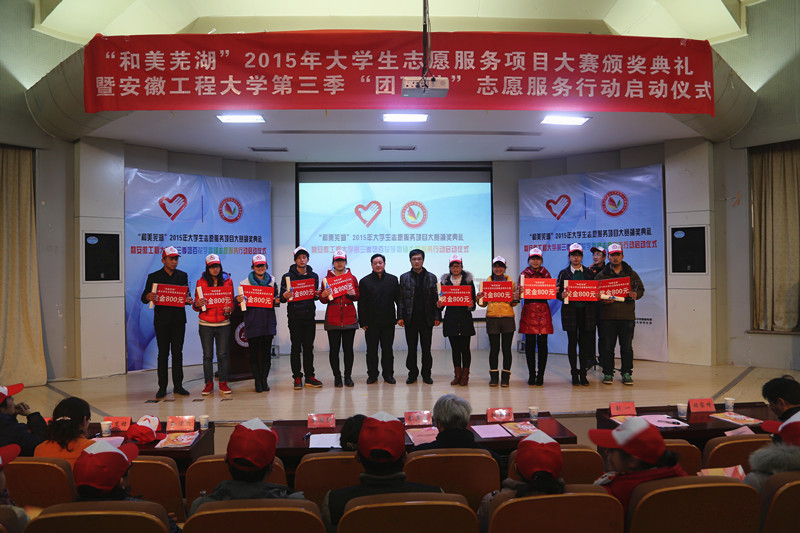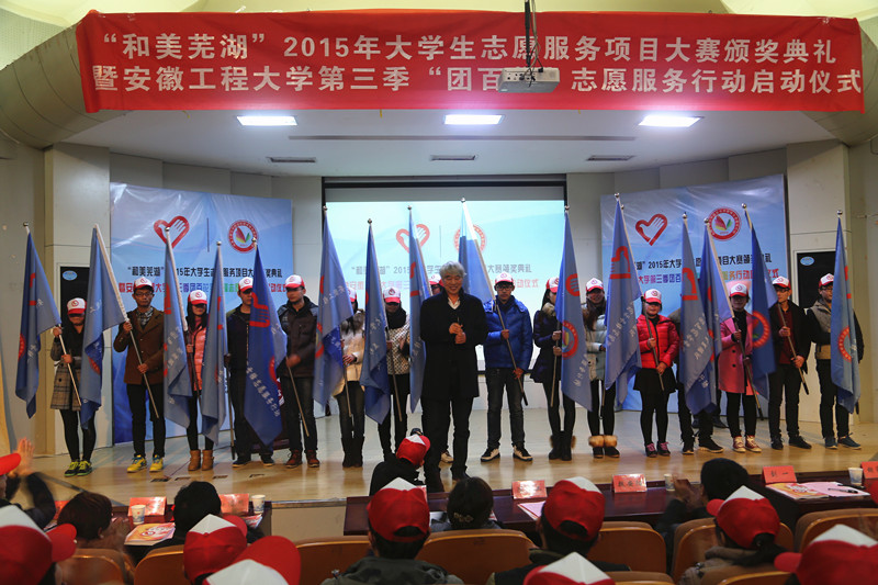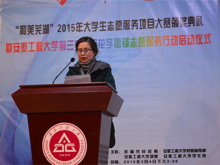 3月4日下午,“和美芜湖”2015年大学生志愿服务项目大赛颁奖典礼暨安徽工程大学第三季“团百花”学雷锋志愿服务行动启动仪式在学术报告厅举行。校党委书记陈其工、校党委副书记苏国红,芜湖市民政局副局长魏安阳,校党委宣传部、学生处、团委负责人出席仪式。仪式由校团委书记刘一主持。