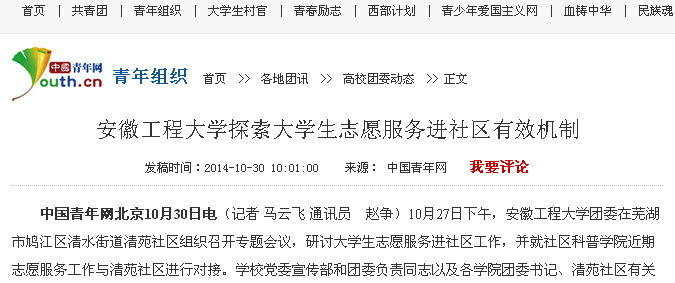 中国青年志愿者网:www.zgzyz.org.cn/content/2014-10/31/content_10871662.htm安徽工程大学探索大学生志愿服务进社区有效机制