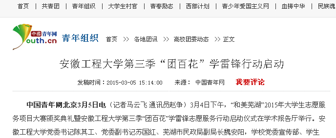 安徽教育网:www.ahedu.gov.cn/28/view/266703.shtml安徽工程大学启动第三季“团百花”学雷锋志愿服务行动