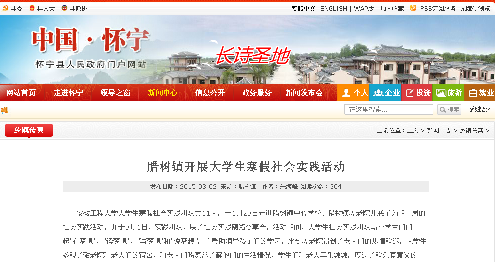 寒假间,我校星火义务支教社赴安庆市怀宁县腊树镇开展了为期7天的假期实践活动,11名大学生放弃假期休息时间为当地孤寡老人和留守儿童开展了一系列社会公益活动,得到了当地政府官网的报道和百姓的好评。