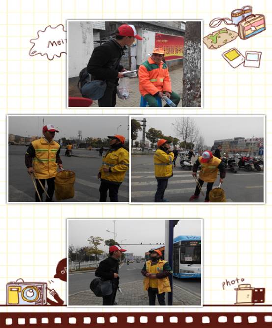 在2015年“和美芜湖”大学生志愿服务项目暨安徽工程大学第三季“团百花”学雷锋志愿服务行动中,我院“满天星”志愿服务团队申报的“环卫工人关怀活动”志愿项目获得铜奖。近日,该团队的志愿服务活动在芜湖市鸠江区和镜湖区全面展开。此次活动内容是为环卫工人送上关怀,旨在提高大学生的环保意识,培养大学生的社会责任感和“奉献、友爱、互助、进步”的志愿服务精神。