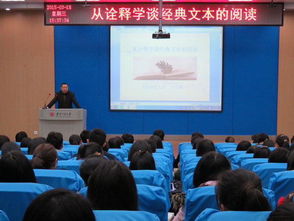 3月18日下午,应我校人文学院邀请,安徽师范大学博士生导师彭启福教授来我校为广大师生作了一场精彩的报告会。报告会的主题为“从诠释学谈经典文本的阅读”。在5教117录播教室,人文学院200多名师生聆听了此场报告。报告会由人文学院副院长刘军主持。